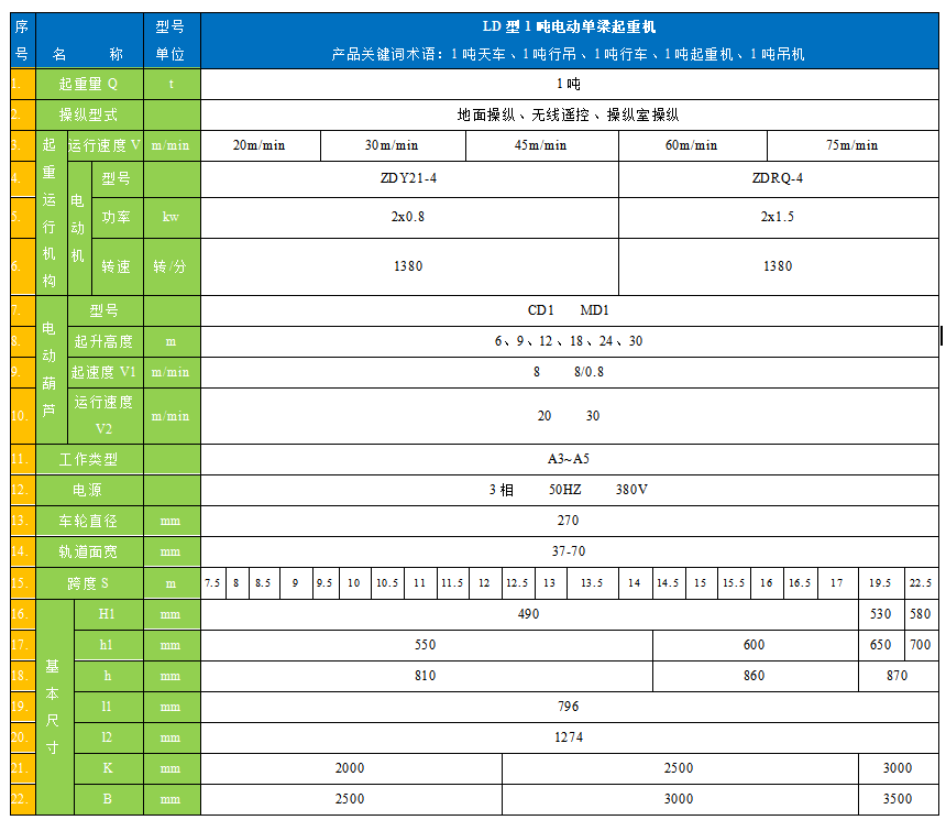 1噸單梁橋式起重機(jī)主要技術(shù)參數(shù)